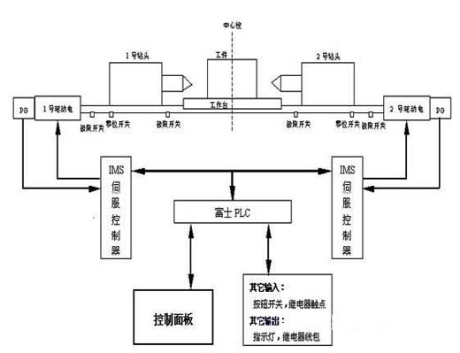每臺(tái)進(jìn)給軸驅(qū)動(dòng)電機(jī)由IMS伺服控制器進(jìn)行位置控制,IMS伺服控制器通過相應(yīng)編碼器(PG)反饋信號(hào)構(gòu)成位置閉環(huán)系統(tǒng)。所有的限位開關(guān)、零位開關(guān)等電氣信號(hào)直接聯(lián)進(jìn)相應(yīng)的控制器做為控制信號(hào)。2臺(tái)伺服控制器利用內(nèi)部集成的PLC功能,通過I/O信號(hào)與控制面板相連(根據(jù)不同用戶的要求,也可使用RS422/485通訊的方式進(jìn)行相應(yīng)的連線)。由于本套設(shè)備相關(guān)參數(shù)不希看能夠由設(shè)備操縱者設(shè)定,因此控制面板上并沒有參數(shù)設(shè)定功能,取而代之的采用了可即時(shí)插拔式手操縱器的方式對(duì)相關(guān)參數(shù)進(jìn)行修改(由相關(guān)技術(shù)職員進(jìn)行修改)。