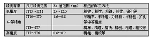 由于零件精度的等級以及相應的加工方法,代表著一個設備的加工精度與效率,有著嚴格的標準和加工要求。首先得到低精度、中等精度、高精度和特別精密精度的加工方法總結如下表1 所示: