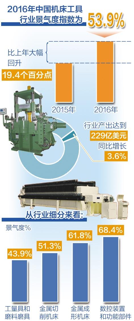 中國(guó)機(jī)床工具工業(yè)協(xié)會(huì)最新數(shù)據(jù)顯示,2016年中國(guó)機(jī)床工具行業(yè)景氣度指數(shù)為53.9%,比上年大幅回升19.4個(gè)百分點(diǎn),反映出行業(yè)運(yùn)行呈現(xiàn)回升態(tài)勢(shì)。