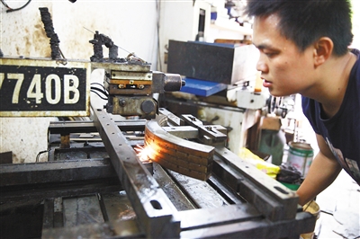 烈日炎炎,在位于?谑旋埲A區(qū)金花路的一處模具加工廠中,車床匠人蔡篤君卻沒有停下忙碌的工作。他弓著腰站在一架龐大的車床前,眼神緊緊鎖定高速運(yùn)轉(zhuǎn)的車床,大滴的汗水從額頭滾滾而下,隨著他雙手熟練地操作,一件精巧的模具在迸濺的火花中逐漸成型。